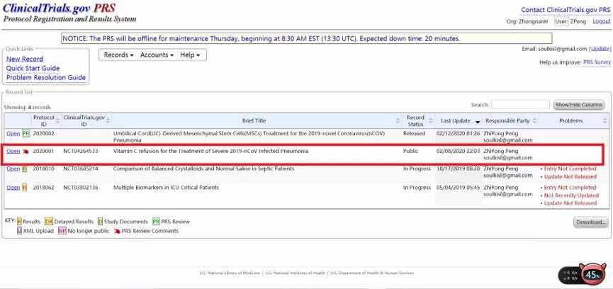 彭志勇教授团队大剂量维生素C治疗新冠肺炎临床试验在美国临床试验Clnicaltrials.gov网站上登记